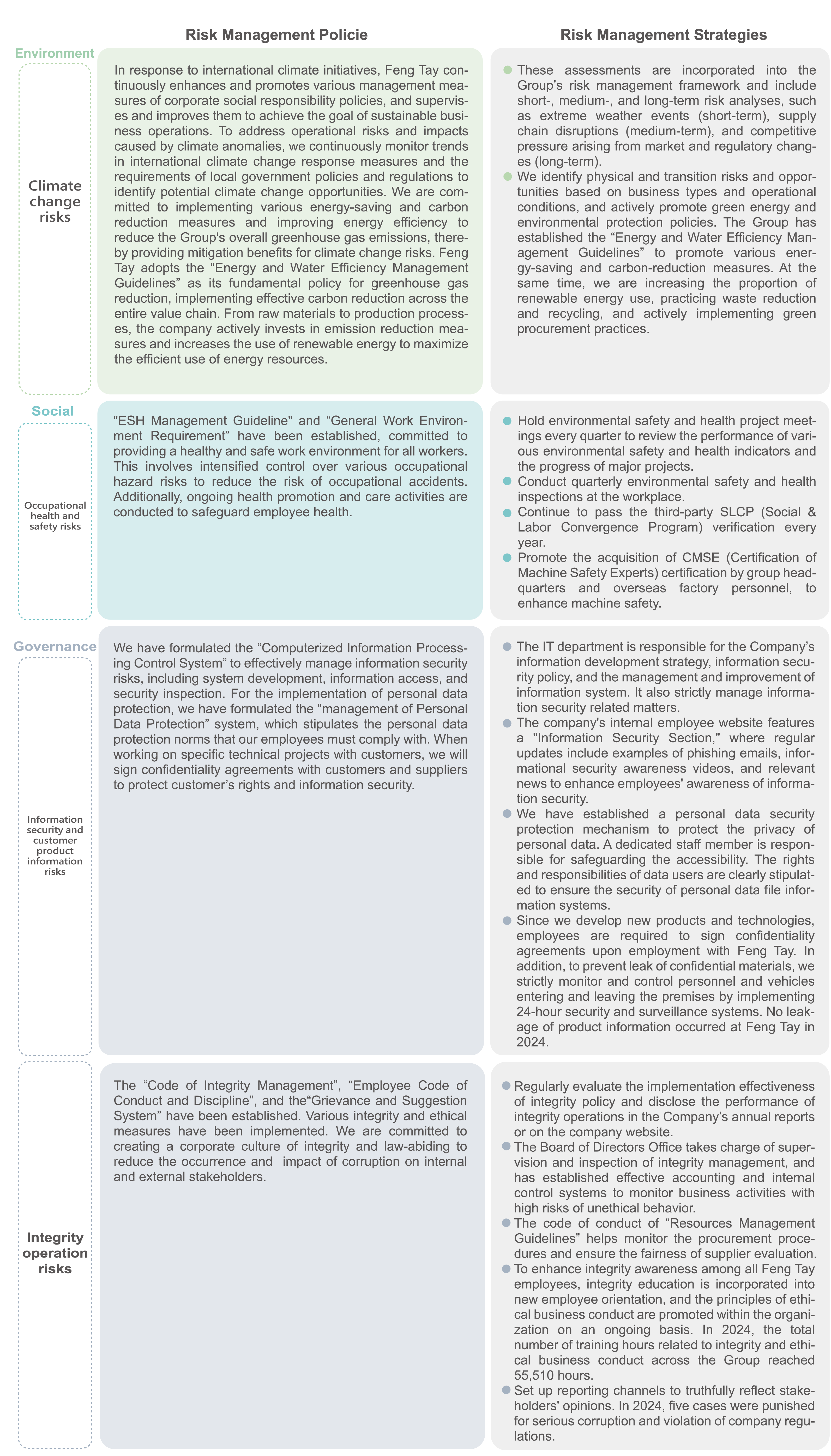 The Sustainable Development Executive Officer annually identifies significant ESG risks and opportunities that may impact the company's operations, financial performance, or corporate reputation based on the principle of materiality. Based on the assessed risks, relevant risk management policies or strategies are formulated. The primary significant risk management policies and strategies identified in 2024 are as follows: