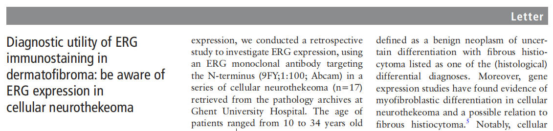 【文獻題目】Diagnostic utility of ERG immunostaining in dermatofibroma: be aware of ERG expression in cellular neurothekeoma.