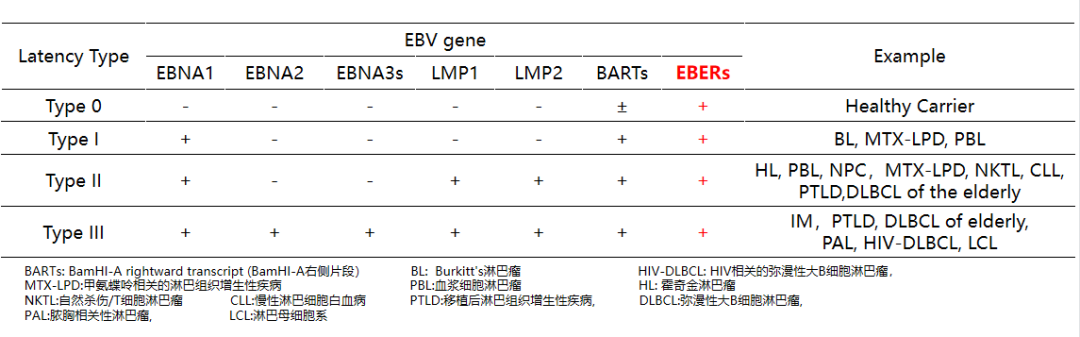 EBERs:指的是2種EBV非編碼RNA(EBER-1、EBER-2)。EBERs在每個(gè)細胞的細胞核中約100萬(wàn)個(gè)拷貝,并在病毒潛伏期和增殖期均高水平表達,是檢測EB病毒感染的有用標志物。