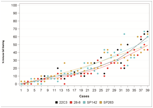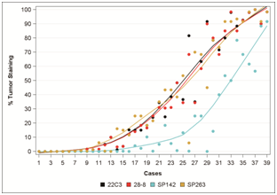 從階段Ⅰ的數據來(lái)看,四種檢測方法中,28-8、22C3和SP263在腫瘤染色方面一致性較好,唯有SP142是個(gè)例外;在四種方法中,免疫細胞上PD-L1的表達較之腫瘤細胞上的表達差異性更大(參見(jiàn)圖1和2);依然有36.9%的病例表現出不一致的結果。免疫組化依然作為檢測PD-L1蛋白表達的金標準,鼓勵使用陽(yáng)性/陰性來(lái)定義PD-L1的表達,但可能會(huì )朝向定義更加多元化的判定來(lái)替代單一的Cutoff值。