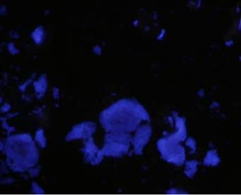 - 灶片狀著(zhù)色 A. 裱片時(shí)水未排盡,或組織的局部形成氣泡使組織突起,染色時(shí)試劑滲入后不易洗盡,顯色過(guò)深。解決辦法是,漂片盒里的氣泡應去盡,漂片時(shí)一旦產(chǎn)生了氣泡可將鑷子伸到水里從組織下面輕輕將氣泡移走。撈片后要傾斜放置幾分鐘利于水流走,然后在放到烤片儀上進(jìn)行烤片。B. 壞死組織灶,組織壞死后細胞破壞、酶的釋放、蛋白游離、分解,復雜的肽鏈殘段(如Fc段)可能與一抗或/和二抗結合導致最終著(zhù)色。解決辦法是在選擇染色切片時(shí)應避免選擇壞死組織較多的組織。C. 制作膠片時(shí),膠的濃度太高,膠在載玻片上不均勻,顯色時(shí)膠厚的地方容易非特異灶片狀著(zhù)色。解決辦法是按照標準的制備方法進(jìn)行。