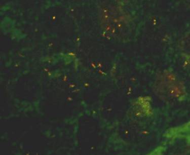 可能的原因 推薦的解決方案 未添加探針(別笑,特別是探針和雜交緩沖液分開(kāi)的非預混情況) 探針充分解凍,確保移液器吸取到探針試劑。 探針、雜交緩沖液使用前沒(méi)有充分混勻(非預混探針) 吹打探針混合液,使探針充分混勻,短暫離心。 探針添加數量不足 確保移液器吸取準確,探針加入量足量,請不要稀釋探針(包括預混和非預混)。 使用前確保探針解凍充分并達到室溫。 變性前標本未制備好 請參照說(shuō)明書(shū)中標本制備相關(guān)說(shuō)明。 標本及探針變性不充分 確保玻片進(jìn)行變性時(shí)溫度在推薦的溫度。 將玻片變性時(shí)間延長(cháng)2~4分鐘。 變性前標本未制備好 請參照說(shuō)明書(shū)中標本制備相關(guān)說(shuō)明。 標本及探針變性不充分 確保玻片進(jìn)行變性時(shí)溫度在推薦的溫度。 將玻片變性時(shí)間延長(cháng)2~4分鐘。 雜交條件不合適 確保遵守雜交所規定的時(shí)間和溫度。 橡皮膠封片時(shí)勿留縫隙。 根據情況,調整雜交時(shí)間(跨度一般較大)和濕度。 雜交時(shí)蓋玻片下有氣泡形成 放蓋玻片時(shí)要覆蓋探針表面,輕輕擠壓以便擠出氣泡。 玻片干燥不充分 探針滴加至玻片前,確保玻片上的乙醇溶液已經(jīng)完全揮發(fā)。 探針干燥太快 探針滴加后應立即將蓋玻片覆蓋目標區域。 進(jìn)行洗脫時(shí),一次只能移除一張玻片上的蓋玻片,并且在移除下一張之前立即將玻片浸入洗脫液中。 洗脫液或洗脫條件不正確 確保按照產(chǎn)品說(shuō)明書(shū)要求配制洗脫液(生產(chǎn)商提供洗脫液的除外)。 確保洗脫液的溫度達到洗脫步驟所規定溫度。 玻片浸入洗脫液前移去蓋玻片。 探針或標本玻片儲存不正確 確保探針-20℃避光保存。 將未雜交玻片干燥后置于-20℃長(cháng)期保存或者室溫短期保存(一般不超過(guò)兩星期)。 將雜交后玻片置于-20℃避光保存。 觀(guān)察時(shí)所選用的濾光片不合適 使用正確濾光片觀(guān)察探針熒光情況。詳情咨詢(xún)探針供應商。 顯微鏡構造及物鏡不適宜觀(guān)察FISH標本,或者濾片組損傷 請聯(lián)系顯微鏡制造商。 汞燈使用時(shí)間超過(guò)設計時(shí)間 請更換汞燈。